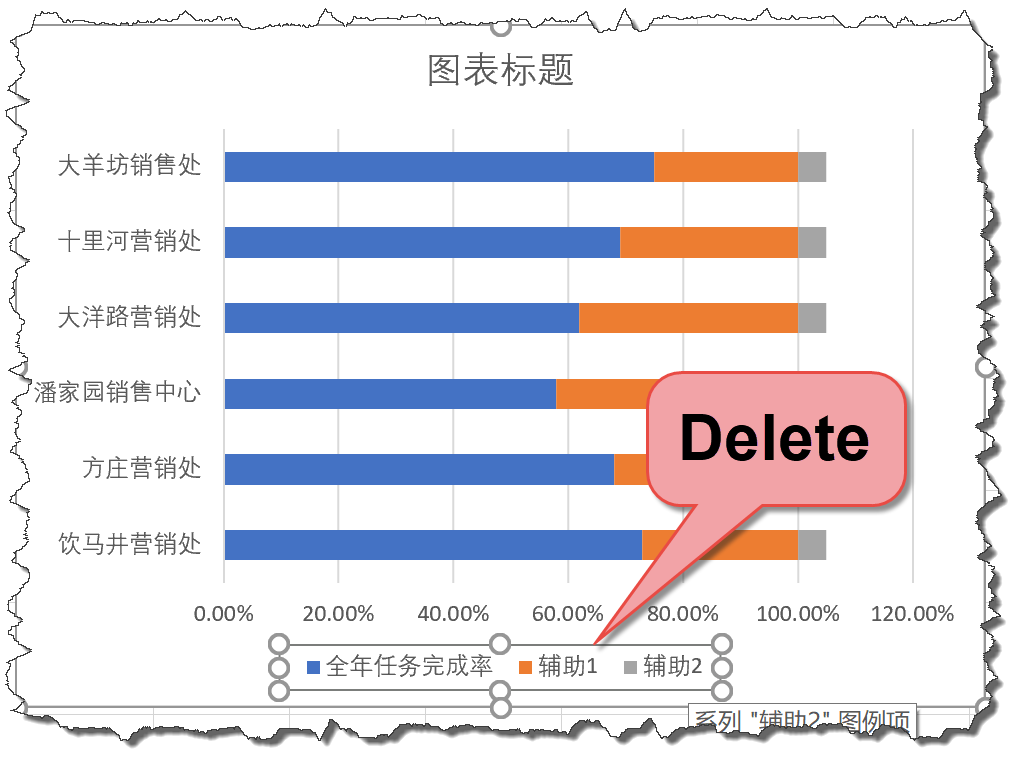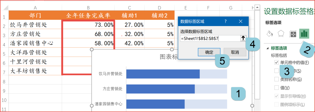 单击任意一个数据标签,设置数据标签格式,在标签选项中去掉“值”的勾选。然后选中“单元格中的值”,在弹出的对话框中选择B2:B7单元格区域的完成率。