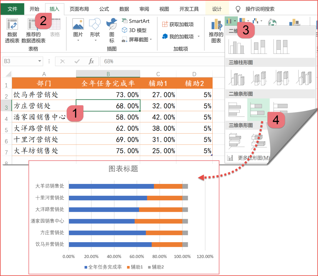 在这个图表中,用深色部分表示完成率,用浅色部分表示剩余,数据标签显示在最右侧,看起来有点新意。C列的辅助列用来显示剩余部分,C2单元格输入公式:D列的辅助列用来添加数据标签,直接输入一个比较小的数值,比如5%,就可以了。单击数据区域任意单元格,插入→柱形图或条形图→堆积条形图:这时候的柱子看起来有点瘦了,双击任意柱子,调整一下间隙宽度: